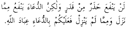 "Kaderden sakınmak kaderi def etmez. Lâkin sâlihlerin duâsı, nüzûl etmiş ve edecek olan elem ve musîbeti def etmeğe ve kaldırmağa medâr olur. İş böyle olunca ey Allah'ın kulları, duâ ediniz." (7)