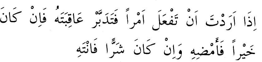 "Bir işe başlamak istediğin zaman âkıbetini iyice tefekkür edip hayr u sevâbı mûcib ise devam et, şerr ü ıkâbı mûcib ise ictinâb et!" (21)