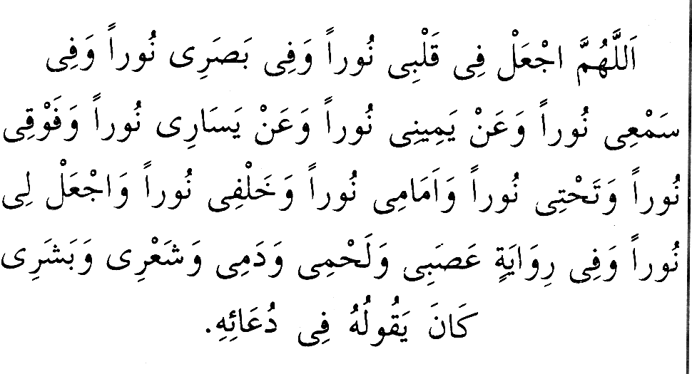 "Yâ Rabb! Kalbimi nurlandır, gözümü nurlandır, kulağımı nurlandır, sağımı nurlandır, solumu nurlandır, üstümü nurlandır, altımı nurlandır, önümü nurlandır, arkamı nurlandır ve beni nûr eyle (bir başka rivayette) benim damarlarımı nurlandır, etimi nurlandır, kanımı nurlandır, saçımı nurlandır, yüzümü nurlandır.” (1)