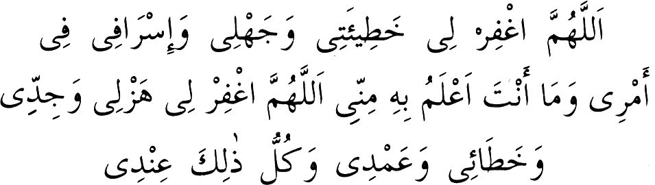 "Yâ Rabb, benim hatâlarımı, bilmeden yapdıklarımı, işimde aşırı gitmemi, ve Senin benden çok iyi bildiğin hallerimi mağfiret eyle. Allah'ım, benim latifeleşmelerimi, ciddiyet hallerimi, hatâen ve kasden yaptıklarımı ve bende olan her şeyimi mağfiret eyle!” (5)